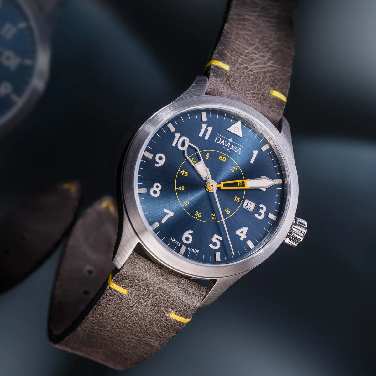 The dial contained within a 42 mm diameter, stainless steel case has a strictly centred design and dispenses with all totalizers. This gives the wristwatch an attractive generosity. The dial carries easily readable Arabic figures to mark the hours. Other features include three hands and an orange, red or yellow minute track on an inner circle. The hour and minute hands are partially skeletonized in opposing ways to differentiate them more fully. The minute hand possesses a colour coordinated frame, so minutes can be read from the inner circle without an additional hand. A fluted crown that is characteristic of DAVOSA is screwed together with the case and remains eminently operable even when wearing pilot’s gloves. A vintage-look, leather strap harks back to the tradition of pilot’s watches. Here too, however, subtly colourful seams testify to a reinterpretation of the pilot’s watch.