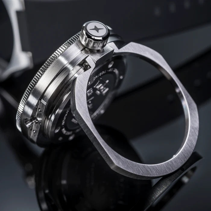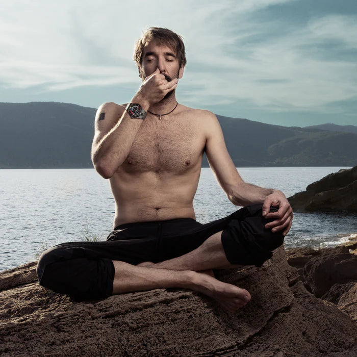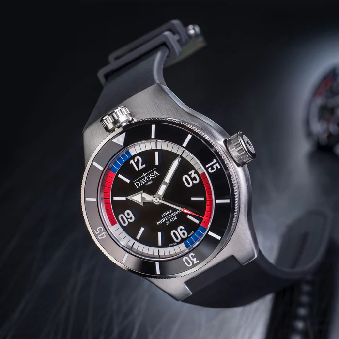 The first striking new feature of the DAVOSA Apnea Diver Automatic is the multi-colored ring around the dial. It sports the French national colors only by chance. In fact the colors blue, white and red replicate an internationally recognized breathing exercise in freediving: A breath is taken during the five-second blue phase, it is held for 15 seconds (white area) and then air is expelled over 10 seconds (red area). With the help of this color code, the freediver can concentrate fully on this vital breathing exercise without needing to count or use a stopwatch. |