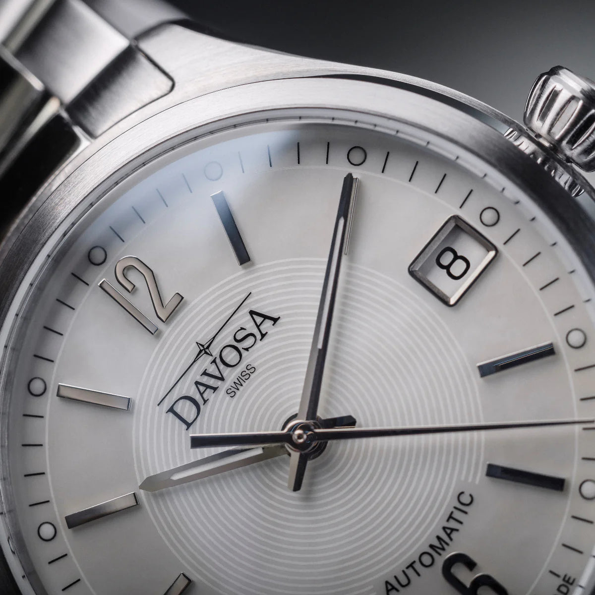 It is this natural brilliance of real mother of pearl that distinguishes the dial of the DAVOSA Newton Lady, which comes in either natural white, ultramarine or oyster Gray. A guilloché area in the centre of the dial is encircled by a smoothly finished zone upon which the hand-applied, silver-plated figures are positioned, which in turn is finished by a detailed minute scale and luminescent dots. The hands are gracefully integrated and beautifully visible at night – also thanks to SuperLumiNova BGW9.