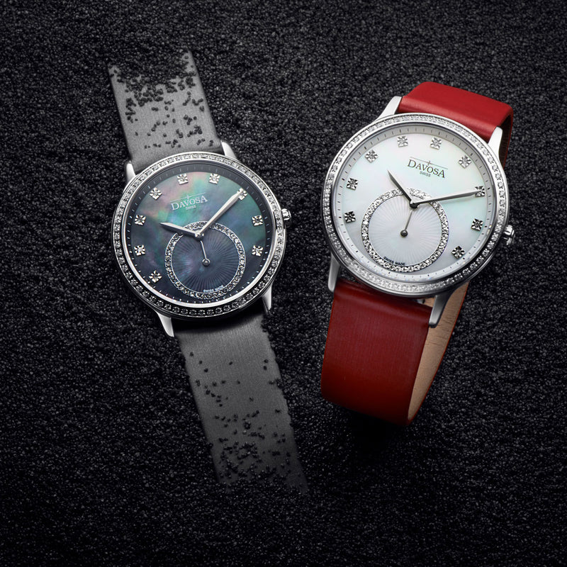 Large and round, the flat stainless steel case is reminiscent of her legendary sun-glasses, while mother-of-pearl and zircon gems on the face and bezel symbolise her timeless elegance. The light-hearted, delicate touch comes from the fine satin-leather straps, specially made by hand for DAVOSA in a small leather goods manufacturer's. Instead of a sweep second-hand, the movement has an offset second-hand close to the '6', which accentuates its looks in an outstanding fashion. Time for you too to feel a little like "Audrey'!