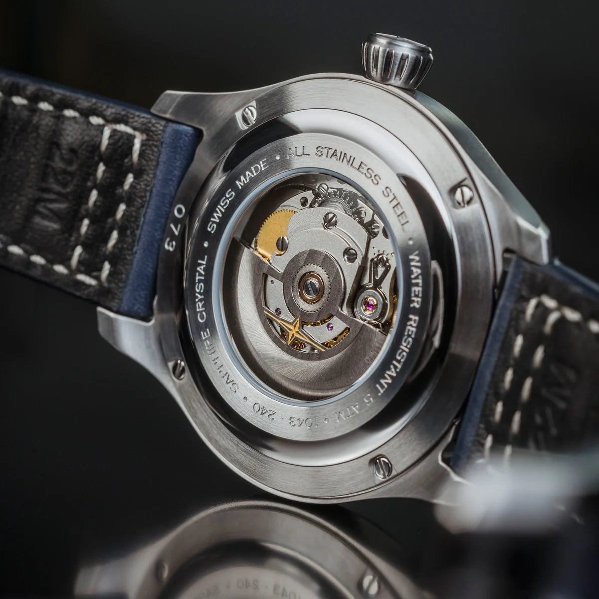 The “12” o'clock position is clearly marked by a triangle; a cursory glance used to be enough for the pilots to recognize the position of the hands unequivocally in order to reliably read the time. The large Arabic numerals and additional indexes on a black background as well as the diamond-shaped hands underline the good legibility. In addition, all elements are noctilucent thanks to the use of the latest SuperLumiNova BG W9 luminous material, which illuminates the dial with a blue shimmer in the dark. A stylized airplane motif with a red tip on the second hand takes up the theme of "flying" in detail.