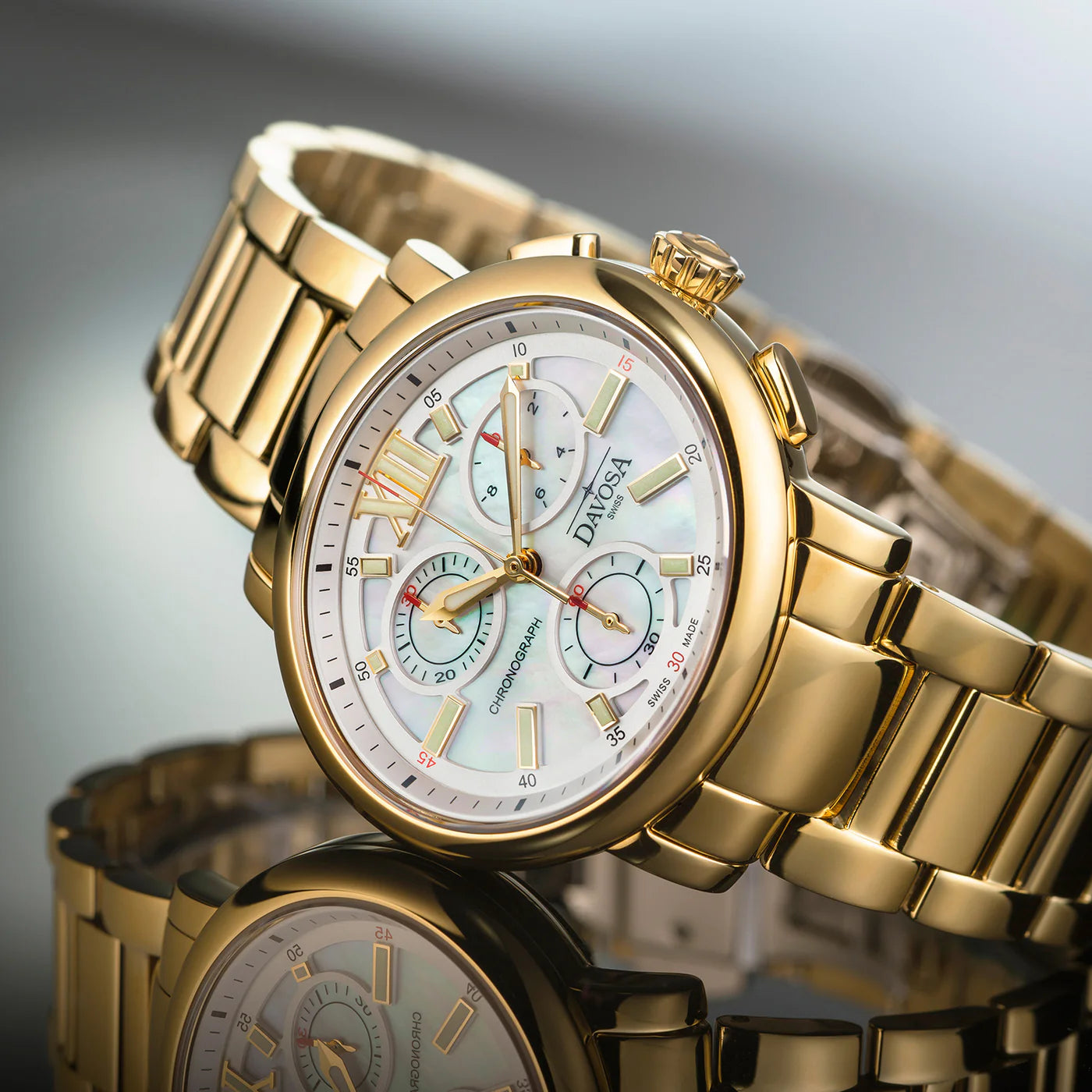 It’s all in the name: a curved oval design dominates the new ladies’ model by Swiss watchmaker DAVOSA. This theme starts from the case, in which a Swiss quality movement ensures maximum accuracy. The unique language of form is continued in the two push studs and totalisers, not to mention the second subdial. The Oval Edition’s dial is an absolute gem regardless of design variation, thanks to both the mother-of-pearl inset and raised dial feature with minute markers. These clear contours contrast fascinatingly with the watch’s feminine style.