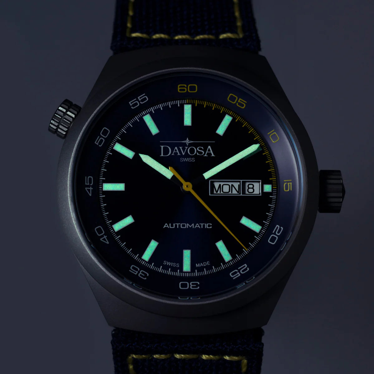 The watch's robustness is underscored by the sandblasted stainless steel case and a rotating bezel. This can be adjusted via a screw-down crown at 10 o’clock, which precludes any inadvertently false settings. With its clear baton markers with Superluminova coating for ease of use even in the dark, the dial boasts both day and date display and is protected by scratch-proof sapphire crystal. Its equivalent on the reverse side of the case is the transparent screw-down back, which provides an excellent view of the ETA 2836-2 movement and guarantees water resistance of up to 100 meters. The Trailmaster Automatic is fastened to the wrist with a strap made of special nylon webbing, a material which convinces due to its excellent resilience and is used, among other things, in the manufacture of motorcycle garments.