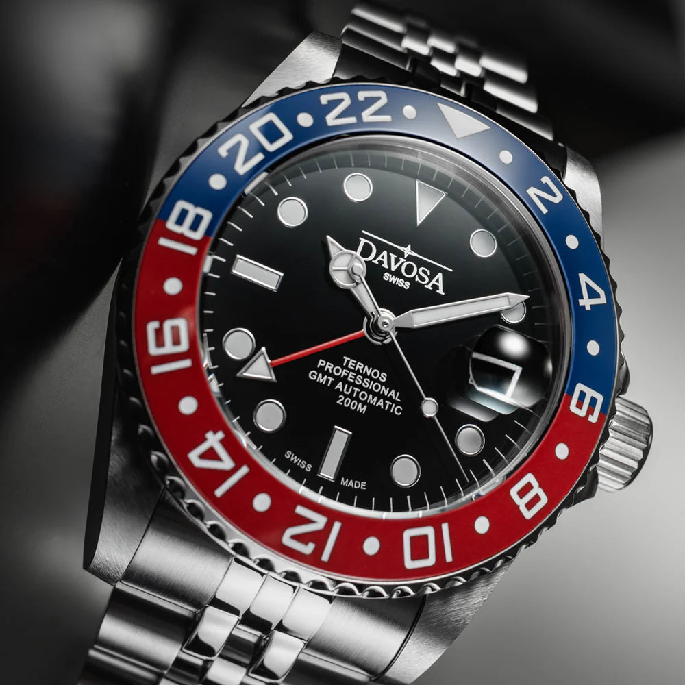 The Davosa Ternos Professional GMT 16157106 takes you back to the time of the first intercontinental flights – and makes you equipped for this challenge, with its GMT function to track effortlessly another timezone. The watch comes with a beautiful unidirectional red and blue “Pepsi” ceramic bezel to easily track a third.