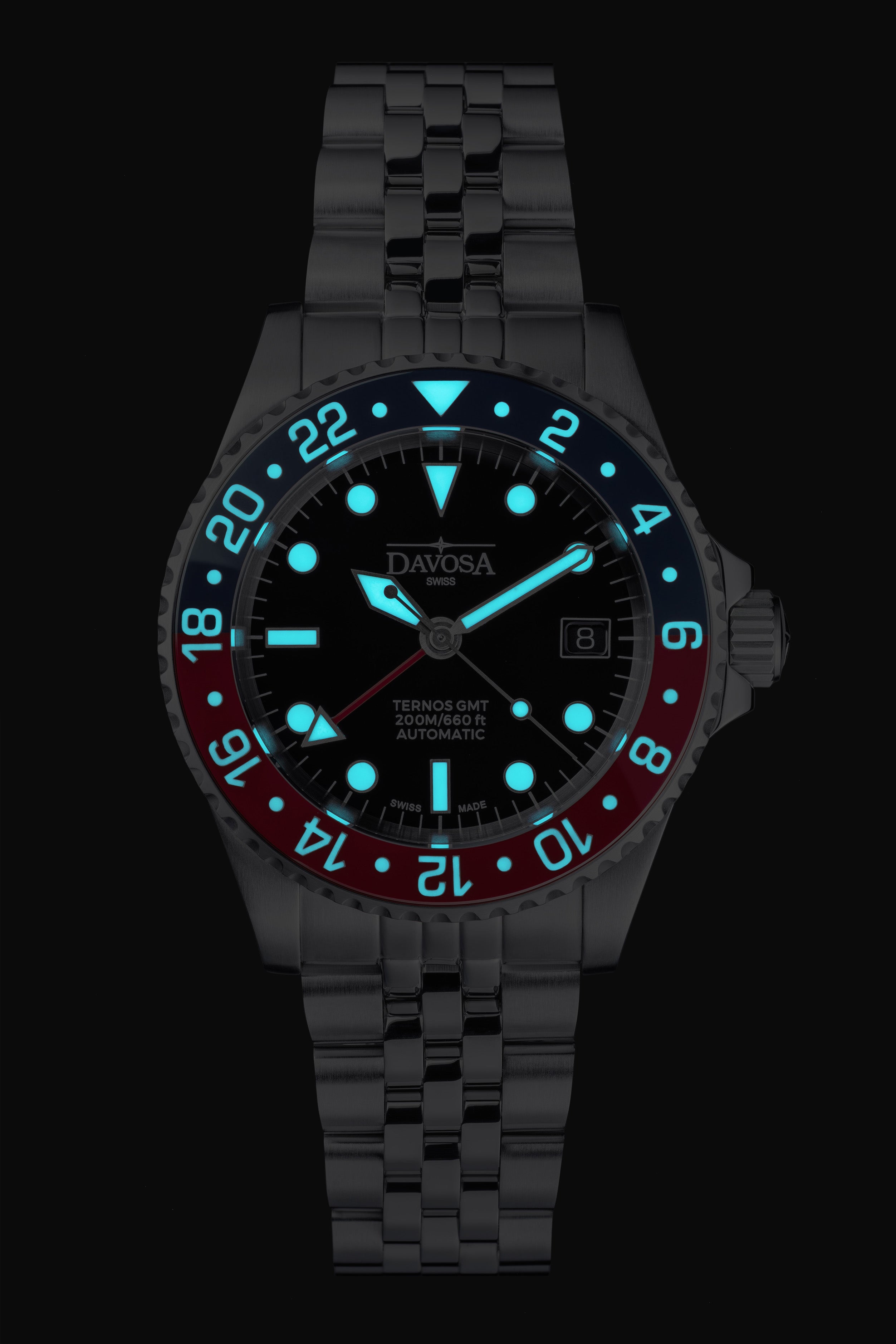DAVOSA’s redesigned Ternos GMT takes everything that made its predecessor a cult favorite — Swiss-made precision, genuine dive capability, and an iconic GMT complication — and sharpens every detail. New hand design. New bezel typography. A 360° luminous bezel that never leaves you in the dark. The same proven performance, built to a higher standard.
