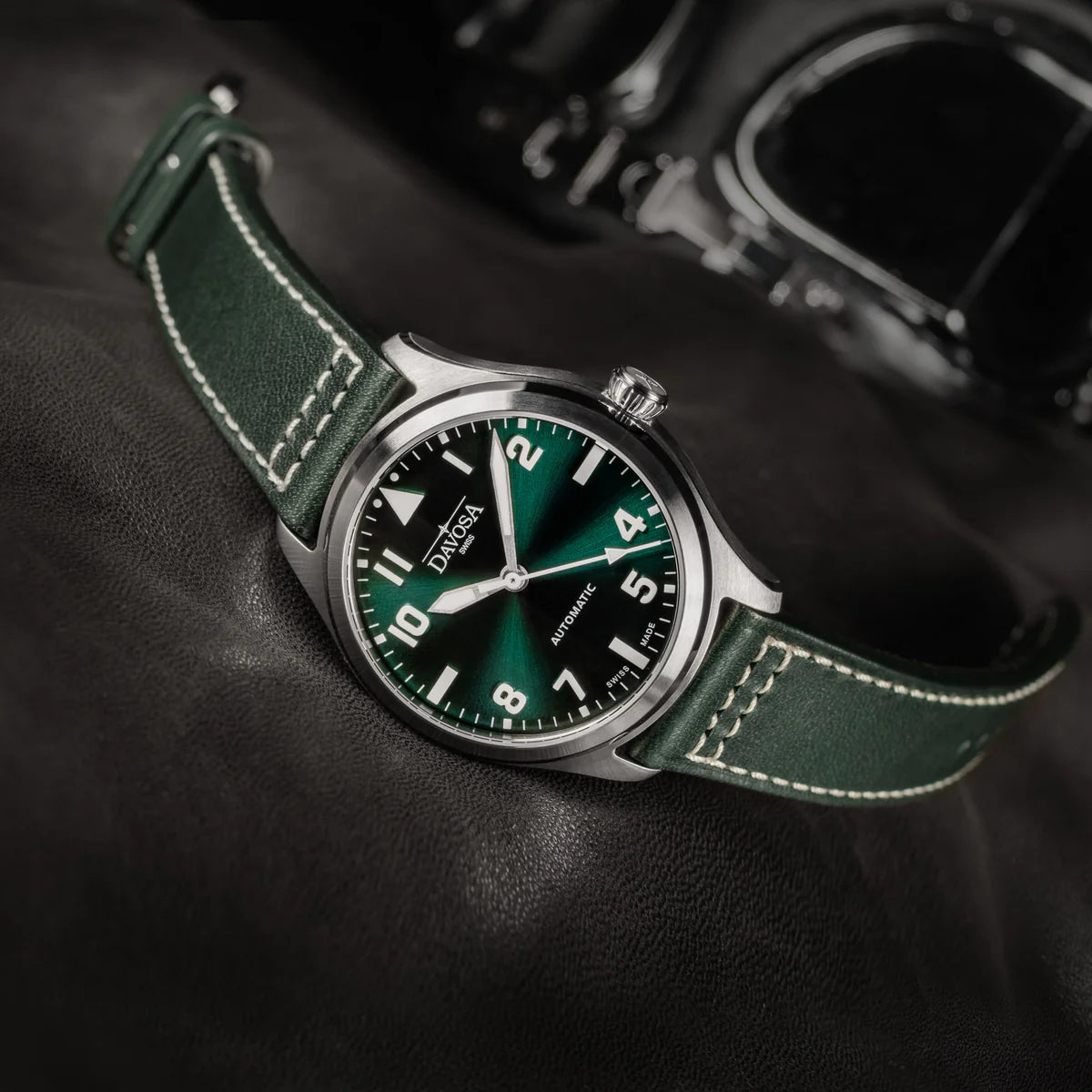 The DAVOSA Newton Pilot Automatic celebrates functional reduction. The precise Swiss automatic movement DAV 3021ND displays the seconds in addition to the hours and minutes and dispenses with the date display.